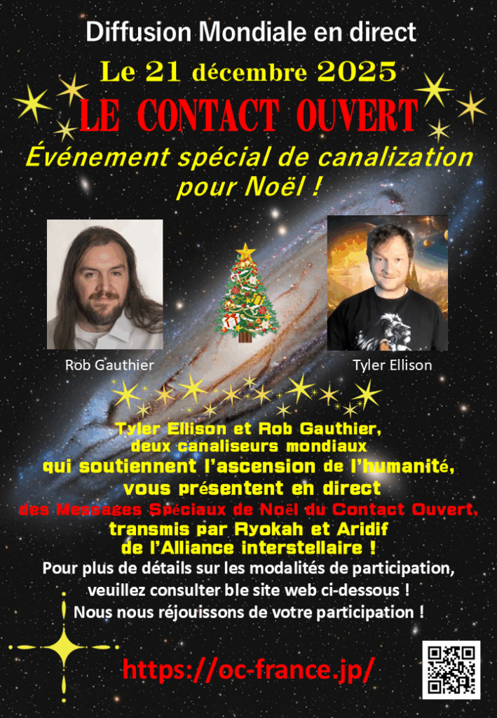Rob Gauthier et Tyler Ellison, deux canaliseurs mondiaux qui soutiennent l’ascension de l’humanité, vous présentent en direct des messages spéciaux Noël sur l’ascension et le contact ouvert, transmis par Aridif et Ryokah de l’Alliance interstellaire !